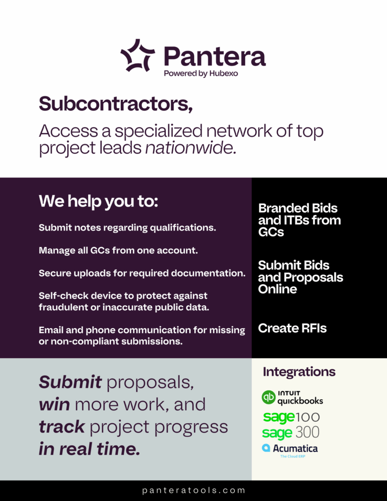 Pantera is your all-in-1 construction management platform. Manage your projects from ITB and preconstruction through completion with Pantera. Send branded bid invites, keep your teams connected from field to office in a white-labeled plan room, and attract more and better bids from subcontractors.